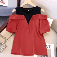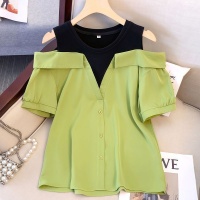 露肩短袖假兩件襯衫女,2025夏季新款,設計感小衆上衣,遮肚子顯瘦小衫